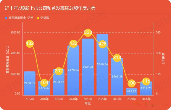 2025年,IPO情况有所回暖。A股上市公司数量为数量116家,募资1318亿元,分别较上年增长16%和104%。