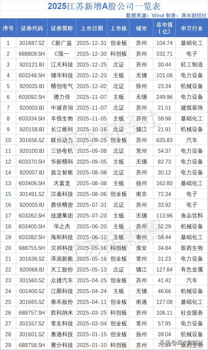 其中,江苏新增29家A股公司,数量位居全国第一,领先广东(21家)和浙江(17家),占全国新增总数的四分之一。