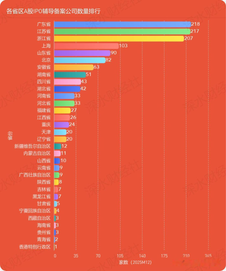 截至2025年末,江苏还有217家企业处于辅导备案阶段,同样排在全国第二位。